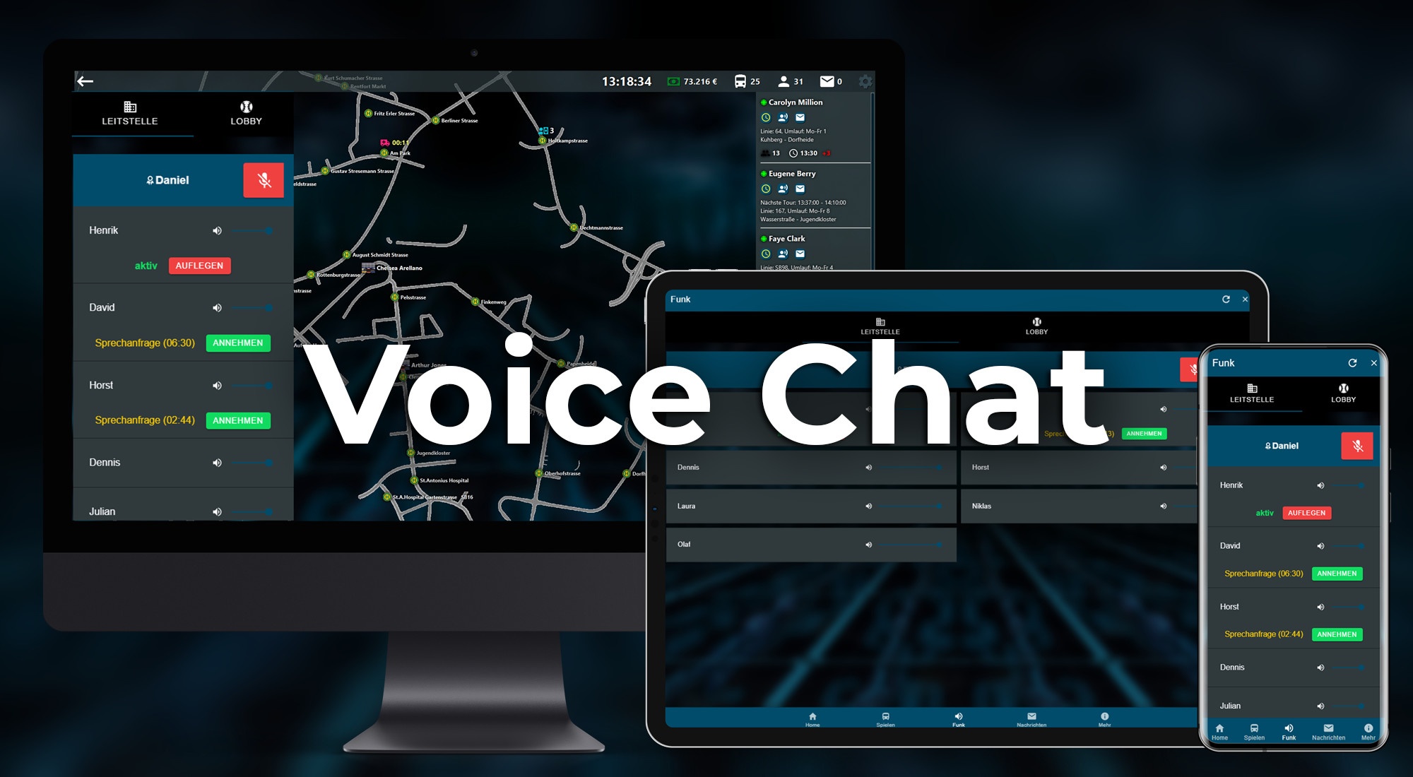 Join a control center event as a bus driver at any time and be part of it! Work together with the control center to complete your shifts perfectly and get the passengers to their destination safely and on time. Besides, you can talk to the other bus drivers and with the control center by radio. Are you more interested in management and solving challenging tasks? Then set up your own control center event alone or together with friends and get into the role of the manager!