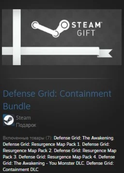 Включенные товары (7): Defense Grid: The Awakening, Defense Grid: Resurgence Map Pack 1, Defense Grid: Resurgence Map Pack 2, Defense Grid: Resurgence Map Pack 3, Defense Grid: Resurgence Map Pack 4, Defense Grid: The Awakening - You Monster DLC, Defense Grid: Containment DLC