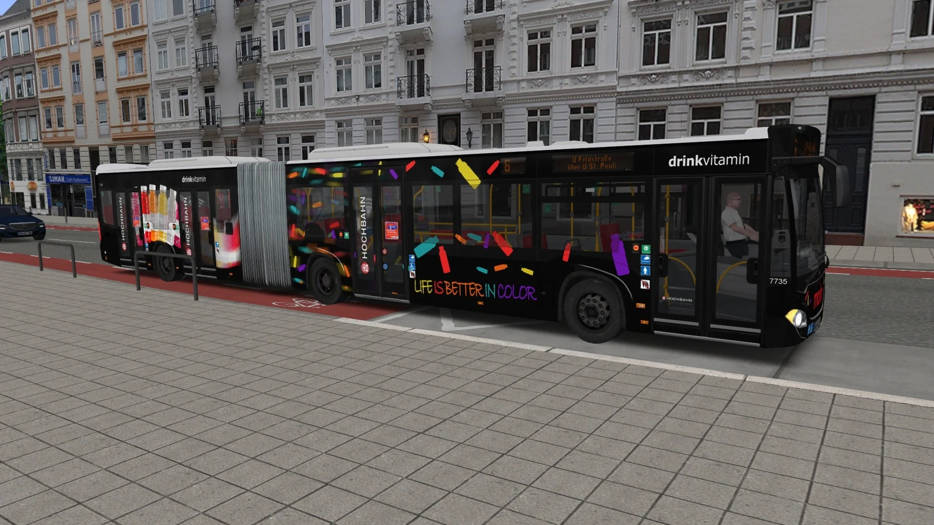 True-to-original exterior sliding doors and interior swing doors, various advertising liveries along the lines of Hamburg’s buses, realistic new engine sounds both from the inside and outside, as well as 4 speed and 6 speed automatic transmissions offer a whole new driving experience.