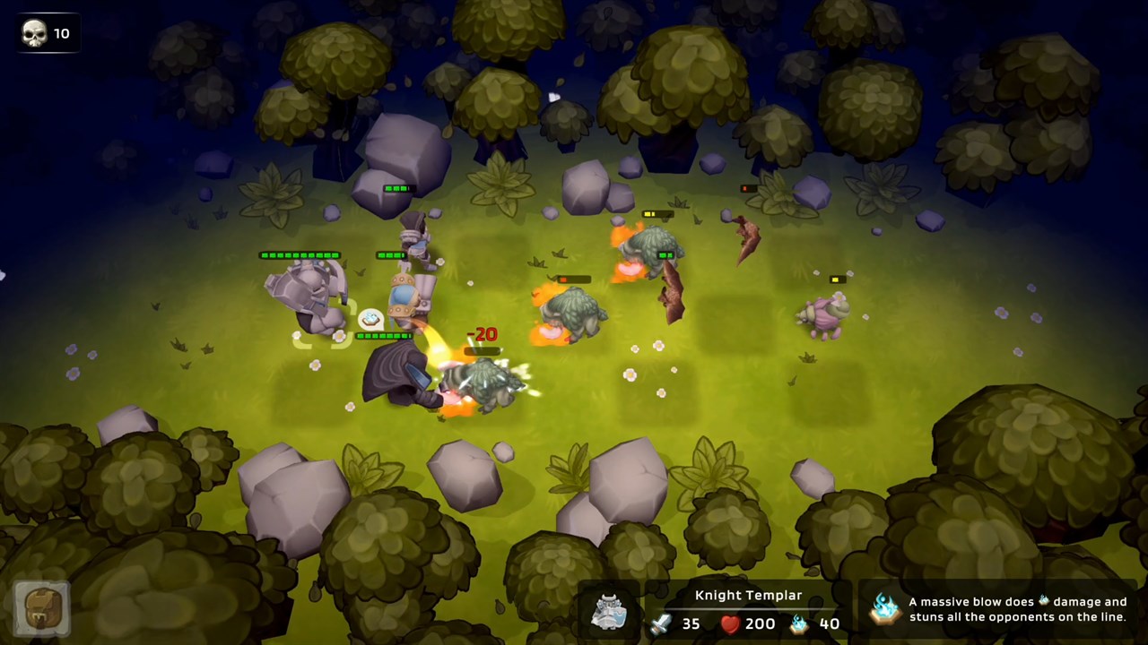 Ключевая особенность игры – уникальная пошаговая система боя. В вашем распоряжении отряд из четырех героев, трое из которых сражаются на передней линии, а последний восстанавливает силы за спинами союзников. Чтобы сделать ход, нужно поменять двух любых героев местами. Если герой выходит с задней линии вперед, он применяет суперспособность. К примеру, рыцарь сотрясает землю, оглушая всех противников на линии, а охотница заряжает лук энергией, выпуская стрелы одновременно во всех противников.