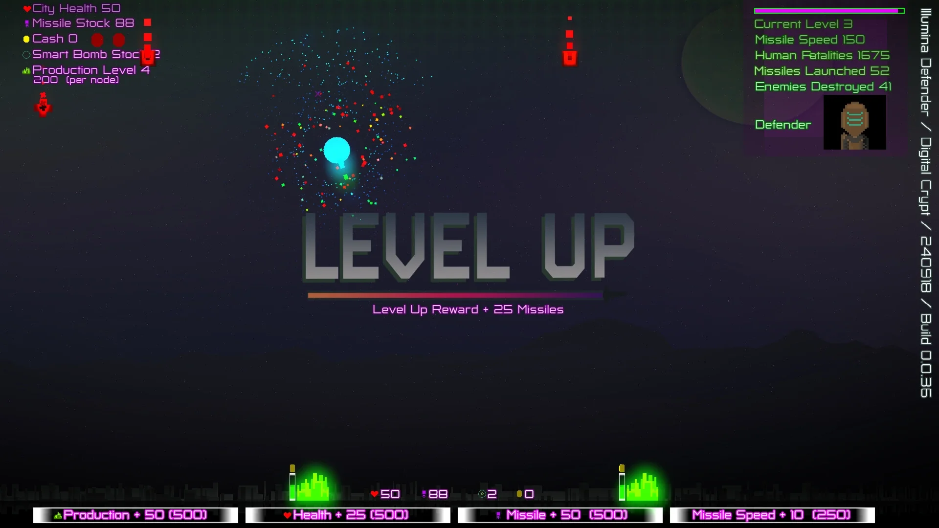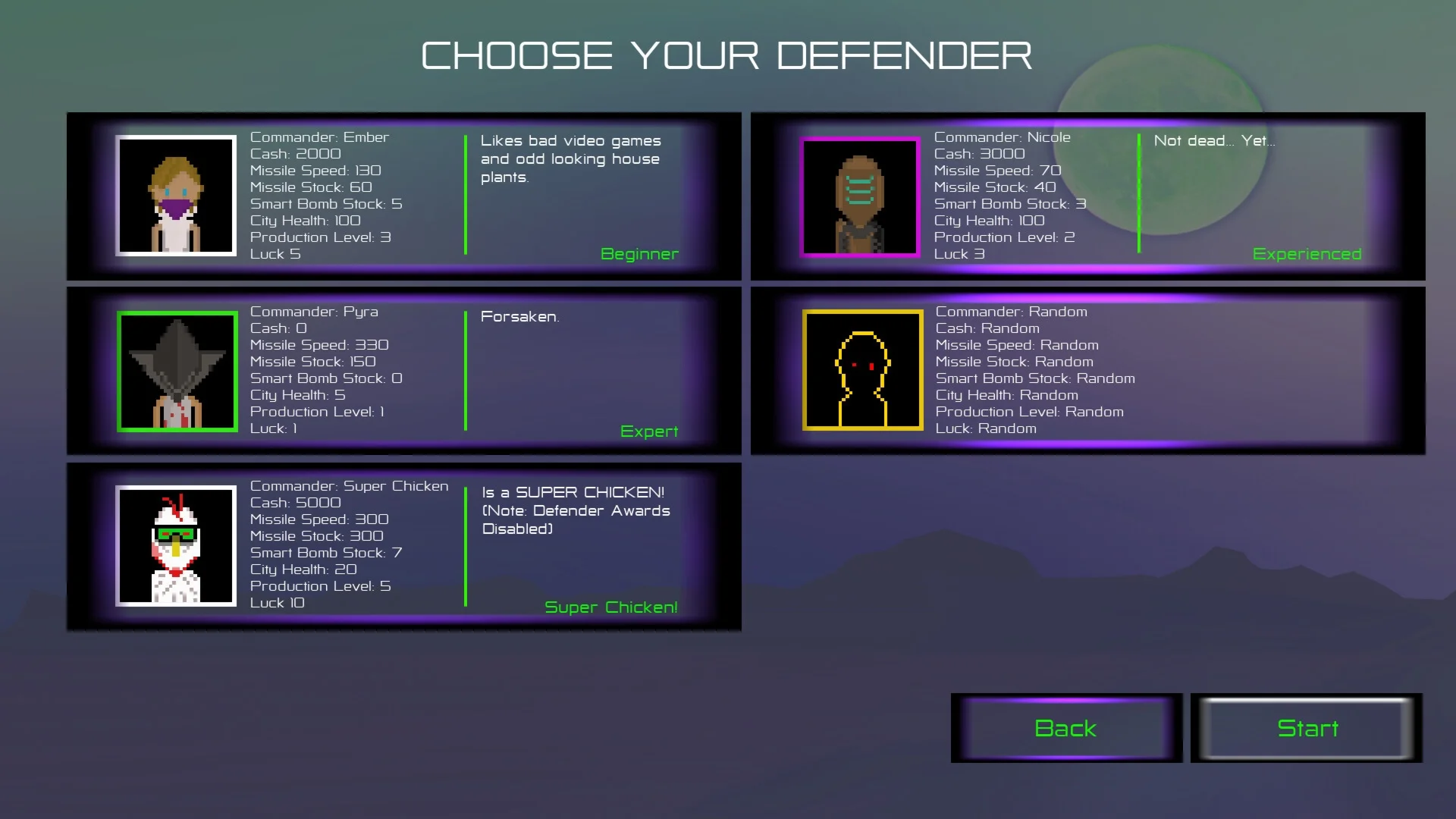 Choose from five unique defenders, including a quirky super chicken, each with distinct stats that add a unique twist to your defense strategy. As enemies descend, you’ll need quick reflexes and strategic planning to purchase essential upgrades. Increase your missile stock, boost missile speed, and enhance city health while managing your resources wisely.