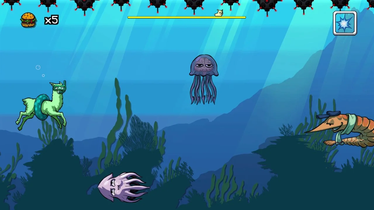 Superola Champion Edition is a challenging runner-style platforming adventure, in which you’ll have to guide a burger loving llama in its quest to defeat the Hotdog Aliens and recover the stolen hamburgers... before they get cold!