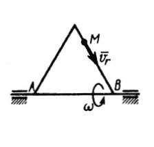 По стороне треугольника, вращающегося вокруг стороны АВ с угловой скоростью ω, движется точка М с относительной скоростью vr = 2 sin 4t. Определить относительное ускорение точки М в момент времени t = ?/8 с. (Ответ 0)