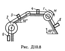 Решение задачи по теормеху из Тарга С.М. 1989 г. Д10 Вариант 80. Условие к задаче Динамика 10 (Полное условие на странице 91): Механическая система состоит из однородных ступенчатых шкивов 1 и 2, обмотанных нитями, грузов 3—6, прикрепленных к этим нитям, и невесомого блока (рис. Д10.0 — Д10.9, табл. Д10). Система движется в вертикальной плоскости под действием сил тяжести и пары сил с моментом М, приложенной к одному из шкивов. Радиусы ступеней шкива 1 равны: R1 = 0,2 м, r1 — 0,1 м, а шкива 2 — R2 = 0,3 м, r2 = 0,15 м; их радиусы инерции относительно осей вращения равны соответственно p1 = 0,1 м и p2 = 0,2 м. Пренебрегая трением, определить ускорение груза, имеющего больший вес; веса Р1, …, Р6 шкивов и грузов заданы в таблице в ньютонах. Грузы, веса которых равны нулю, на чертеже не изображать (шкивы 1, 2 изображать всегда как части системы).