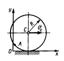 Вследствие удара колесо радиуса R = 0,2 м катится с постоянной скоростью центра vc = 0,1 м/с. Определить абсциссу точки A в момент времени t1 = 1 с, если в момент t0 = 0 точка A находилась в начале координат. (Ответ 4,11•10-3)