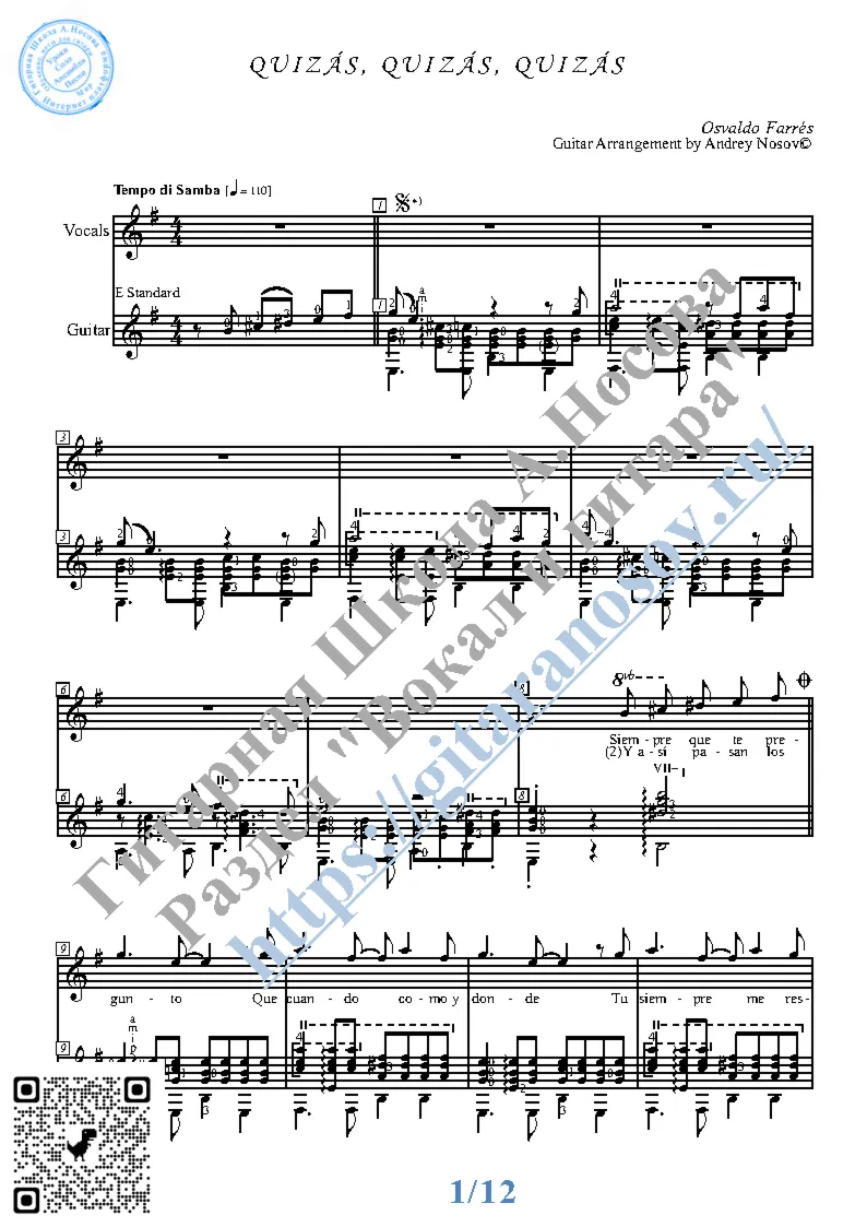 Вашему вниманию предлагается композиция "Quizas, Quizas, Quizas (O.Farres)", предназначенная для вокала в сопровождении 6-ти струнной гитары. Запись выполнена нотами и включает в себя партию вокала с подтекстовкой, партию гитары с подробнейшей аппликатурой и текст песни (НА ПОРТУГАЛЬСКОМ). Партия гитары продублирована табулатурой. Товар состоит из двух частей: 1 – Ноты с табулатурой; 2 – Ноты без табулатуры (в одном PDF). Прилагается ссылка на прослушивание / скачивание mp3.