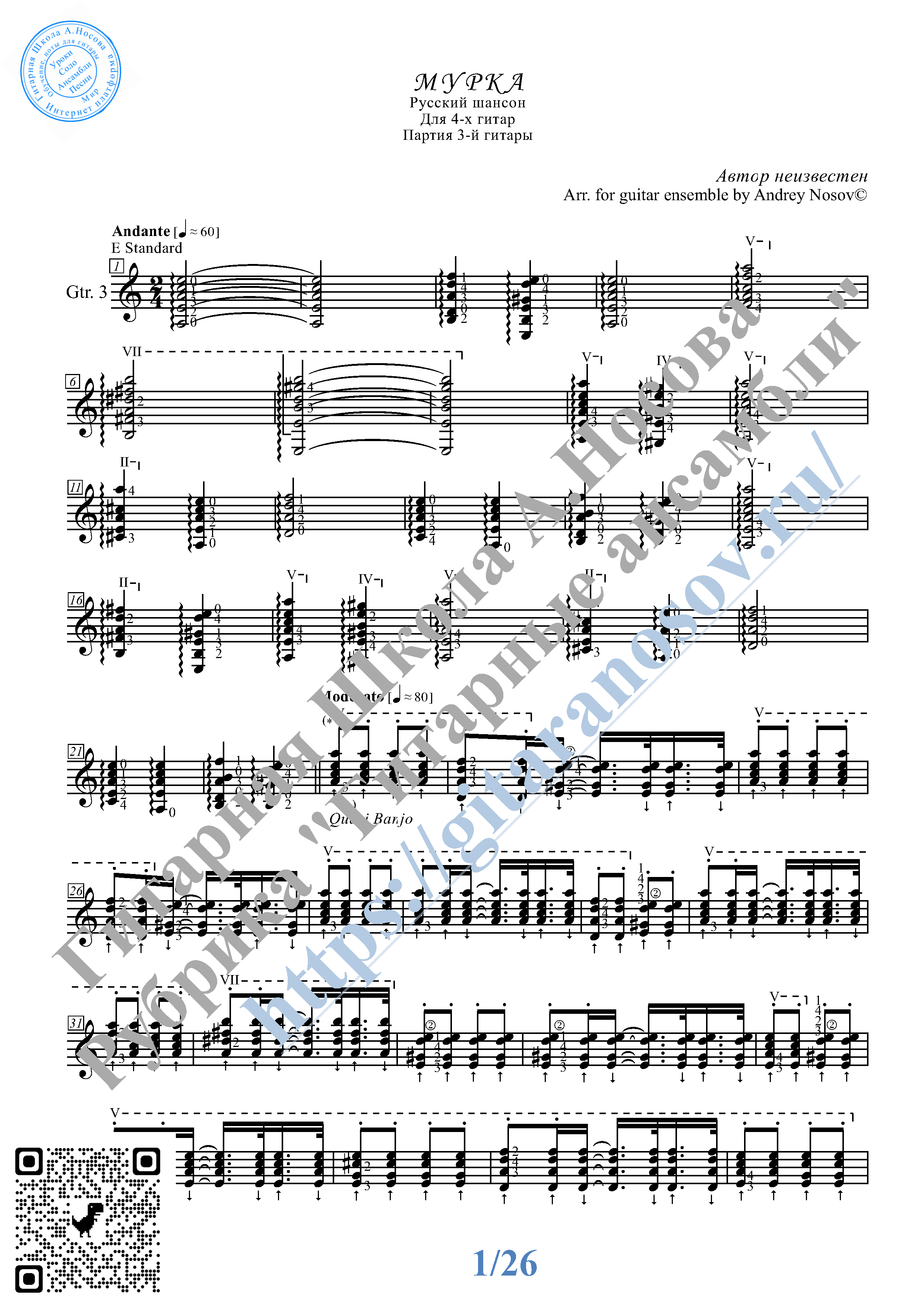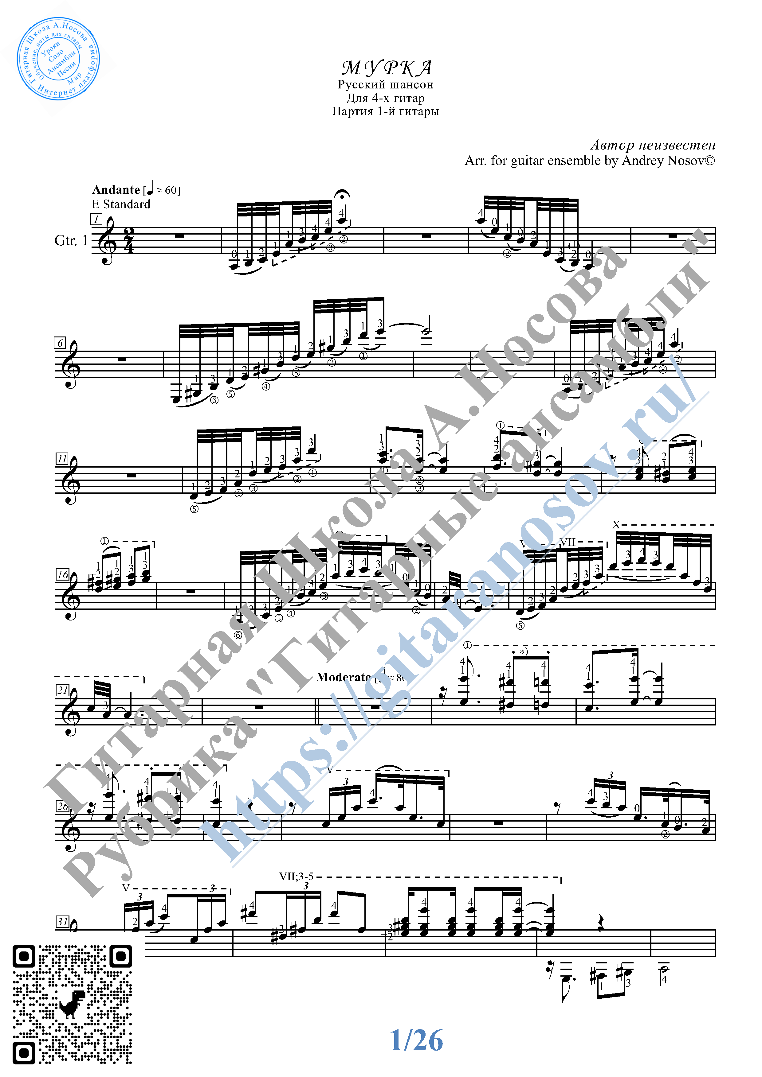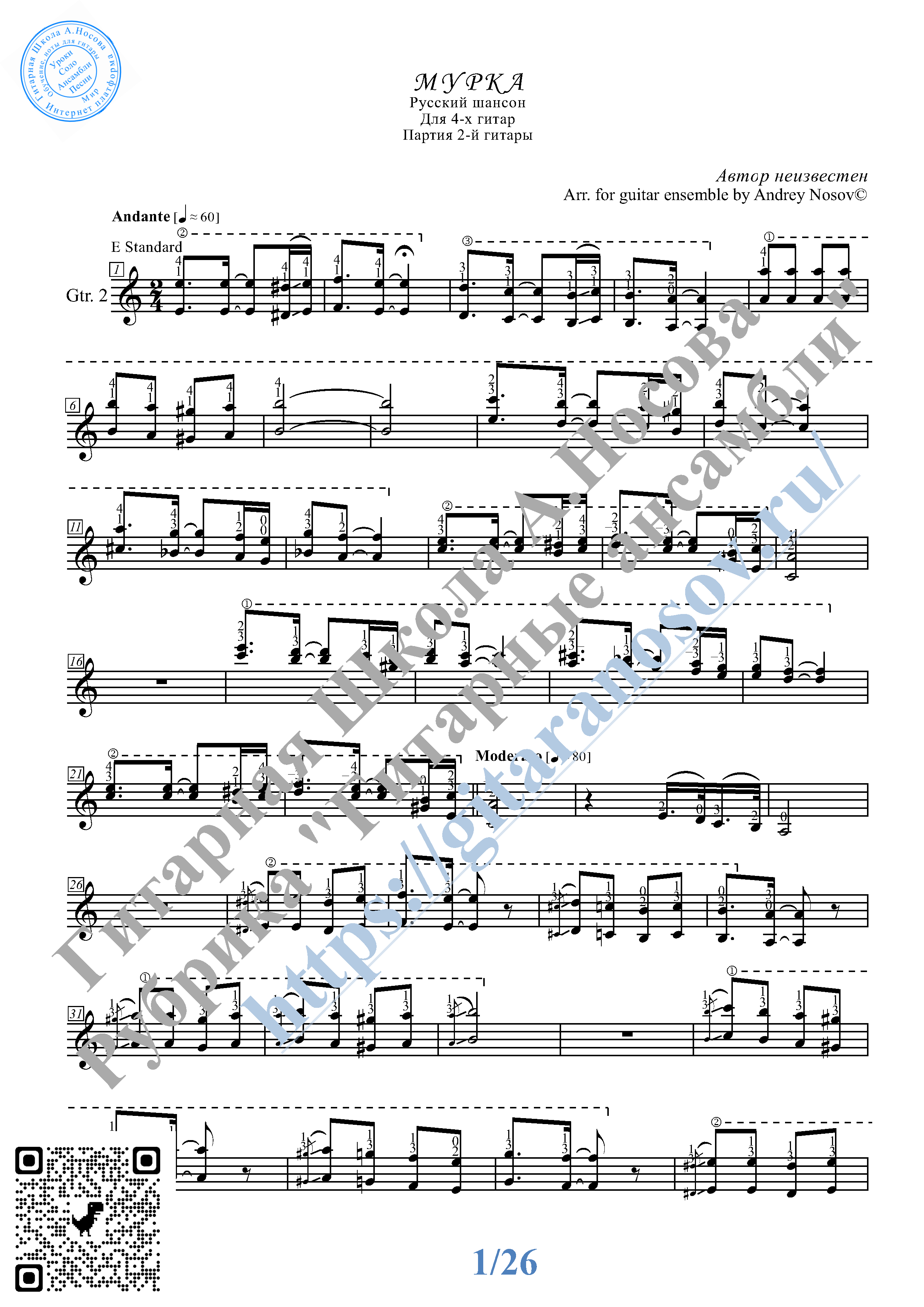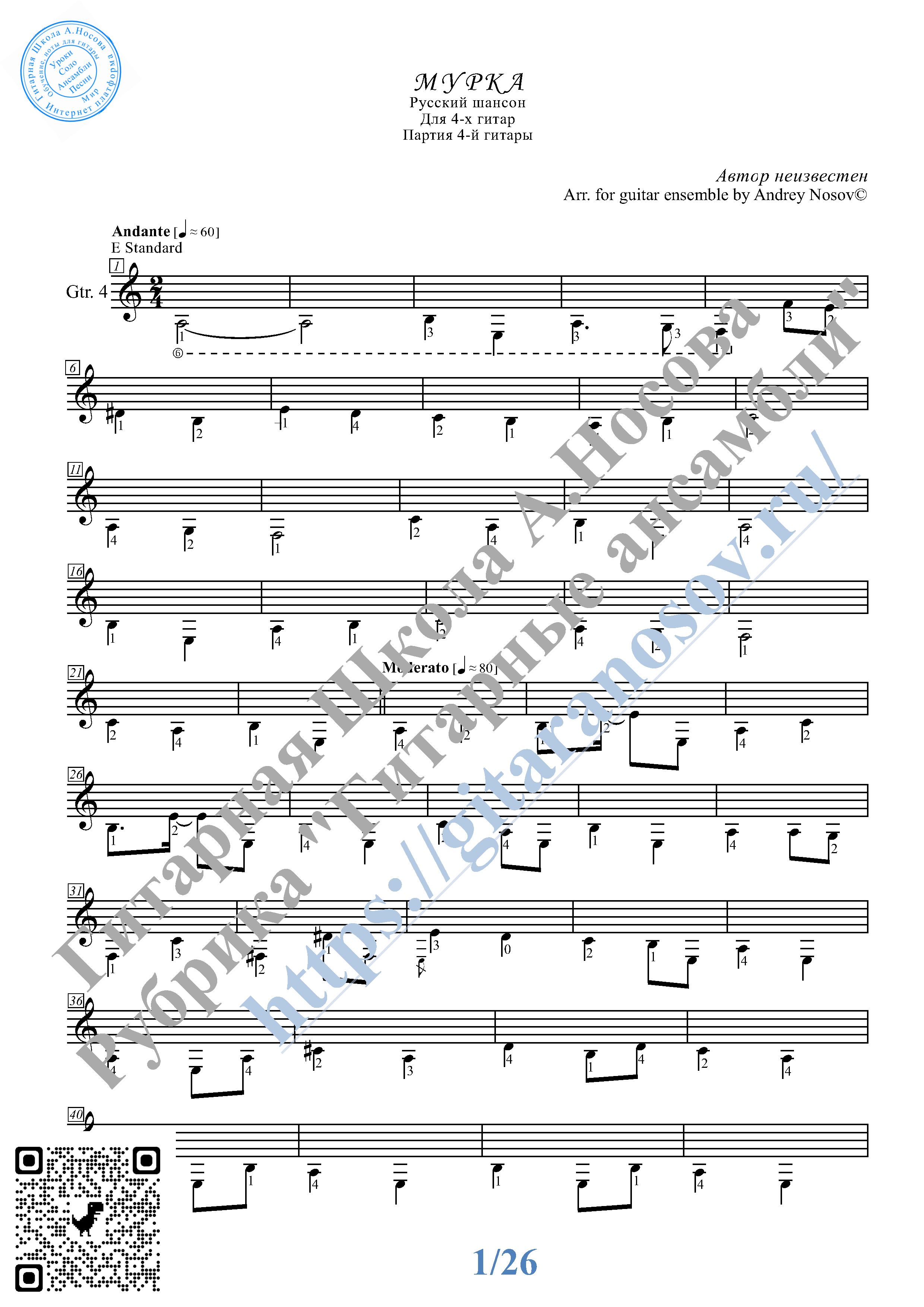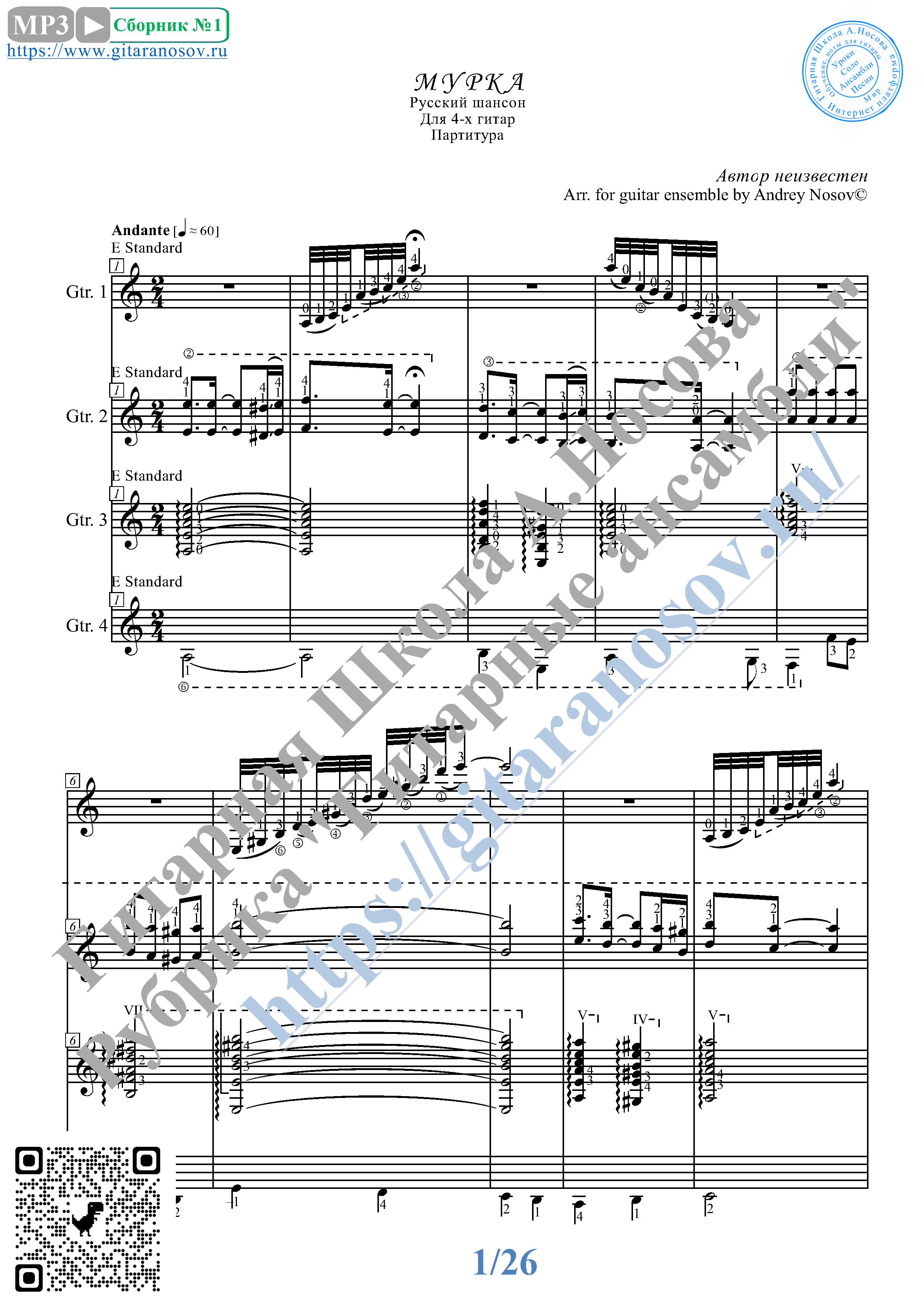 Музыка, ноты, тексты песен » Мурка (Ноты для 4-х гитар)