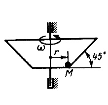Чаша вращается с постоянной угловой скоростью ω вокруг вертикальной оси. Определить наибольшее значение угловой скорости, при которой материальная точка М еще не начнет подниматься но стенке чаши. Коэффициент трения скольжения между точкой М и стенкой чаши f = 0,1, радиус r = 0,2 м. (Ответ 7,74)