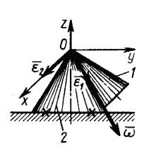 При качении конуса 1 по неподвижному конусу 2 в данный момент времени компоненты углового ускорения ϵ1 и ϵ2 (параллельная и перпендикулярная вектору угловой скорости ω) имеют значения: ϵ1 = 0,1 π; ϵ2 = 0,2 π. Определить угловое ускорение. (Ответ 0,702)