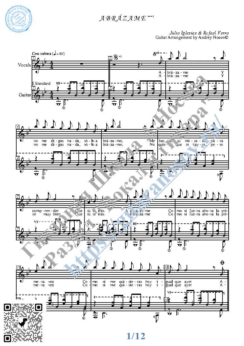 Вашему вниманию предлагается композиция "Abrazame (J.Iglesias-R.Ferro)", предназначенная для вокала в сопровождении 6-ти струнной гитары. Запись выполнена нотами и включает в себя партию вокала с подтекстовкой, партию гитары с подробнейшей аппликатурой и текст песни (НА ИСПАНСКОМ). Партия гитары продублирована табулатурой. Товар состоит из двух частей: 1 – Ноты с табулатурой; 2 – Ноты без табулатуры (в одном PDF). Прилагается ссылка на прослушивание / скачивание mp3.