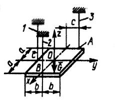 Прямоугольная однородная пластинка закреплена горизонтально с помощью трех нитей 1, 2 и 3, закрепленных в точках А, В и С. Определить расстояние с расположения точки А от оси симметрии, при котором нити будут натянуты одинаково, если вес пластинки G = 3Н, расстояния а = 0,2 м и b = 0,1 м. (Ответ 0,1)
