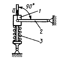 Ползун 1 массой 3 кг под действием сжатой пружины 3 начинает двигаться из состояния покоя с ускорением а = 10 м/с2. Механизм расположен в горизонтальной плоскости. Масса однородного тонкого стержня 2 равна 3 кг. Определить усилие пружины. (Ответ 40)