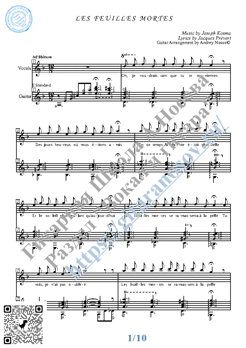 Вашему вниманию предлагается композиция "Les Feuilles Mortes (mus.J.Kosma, lir.J.Prevert)", предназначенная для вокала в сопровождении 6-ти струнной гитары. Запись выполнена нотами и включает в себя партию вокала с подтекстовкой, партию гитары с подробнейшей аппликатурой и текст песни (НА ФРАНЦУЗСКОМ). Партия гитары продублирована табулатурой. Товар состоит из двух частей: 1 – Ноты с табулатурой; 2 – Ноты без табулатуры (в одном PDF). Прилагается ссылка на прослушивание / скачивание mp3.