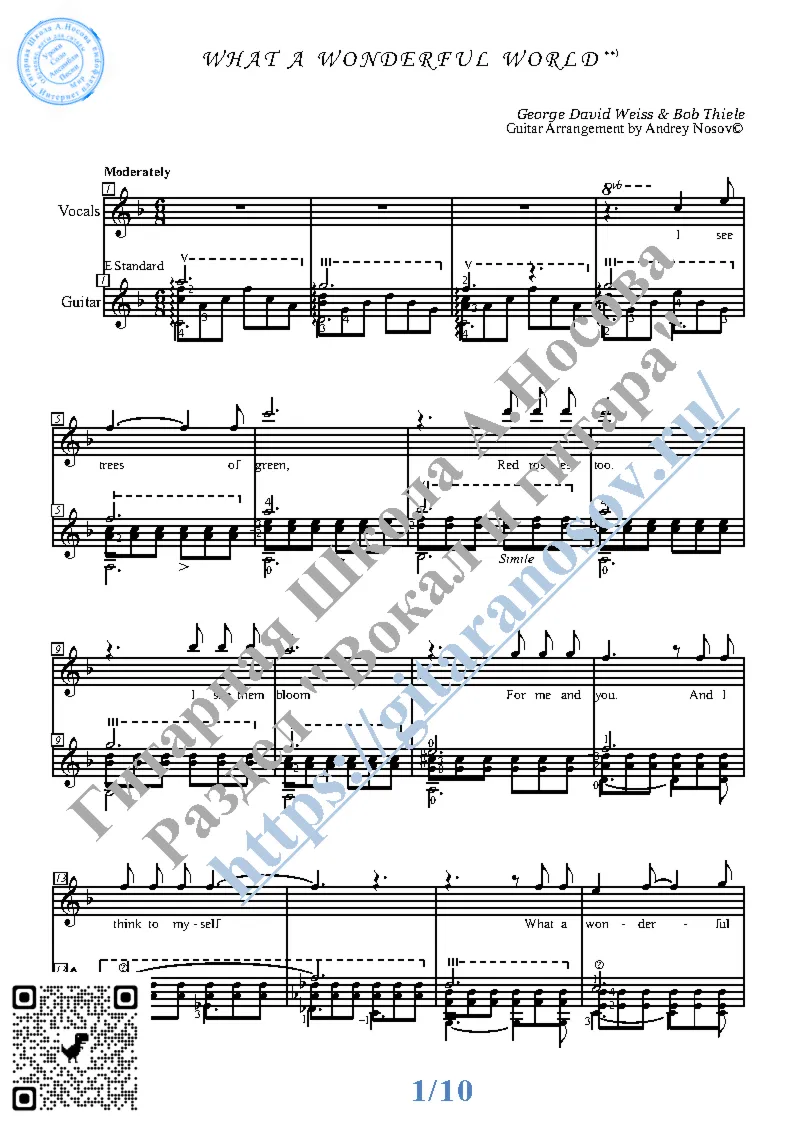 Вашему вниманию предлагается композиция "What a Wonderful World (G.D.Weiss-B.Thiele)", предназначенная для вокала в сопровождении 6-ти струнной гитары. Запись выполнена нотами и включает в себя партию вокала с подтекстовкой, партию гитары с подробнейшей аппликатурой и текст песни (НА АНГЛИЙСКОМ). Партия гитары продублирована табулатурой. Товар состоит из двух частей: 1 – Ноты с табулатурой; 2 – Ноты без табулатуры (в одном PDF). Прилагается ссылка на прослушивание / скачивание mp3.
