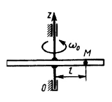 Трубка вращается вокруг вертикальной оси Oz, ее момент инерции Iz = 0,075 кг • м2. По трубке под действием внутренних сил системы движется шарик М массой m = 0,1 кг. Когда шарик находится на оси Oz, угловая скорость ω0 = 4 рад/с. При каком расстоянии l угловая скорость равна 3 рад/с? (Ответ 0,5)