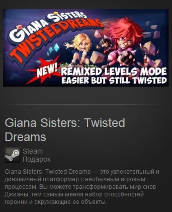 Вы покупаете официальный Steam Gift (подарок) активации игры Giana Sisters: Twisted Dreams (Region Free). После оплаты вы получаете ссылку для активации игры, при переходе по которой игра активируется на ваш аккаунт или будет добавлена в инвентарь. Также дубликат ссылки на страничку с гифтом придёт на почту, указанную при покупке.