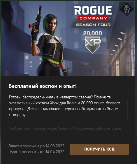Готовы беспредельничать в четвертом сезоне? Получите эксклюзивный костюм Xbox для Ronin и 20 000 опыта боевого пропуска. Для использования перка необходима игра Rogue Company.