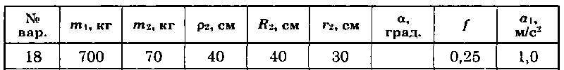 Для приведенных на схемах 1-30 механических систем, используя принцип Даламбера, определить величину силы F,необходимую для перемещения груза с заданным ускорением а1, а также усилие в грузовом тросе. Исходные данные: массы груза т1 и барабана т2, радиус барабана R2 (у двойного барабана имеется также r2), его радиус инерции р2 (если он не указан, тело считать однородным цилиндром), угол а и коэффициент трения скольжения f приведены в таблице. Непронумерованные блоки и катки считать невесомыми. Трением на осях барабана и блоков пренебречь.