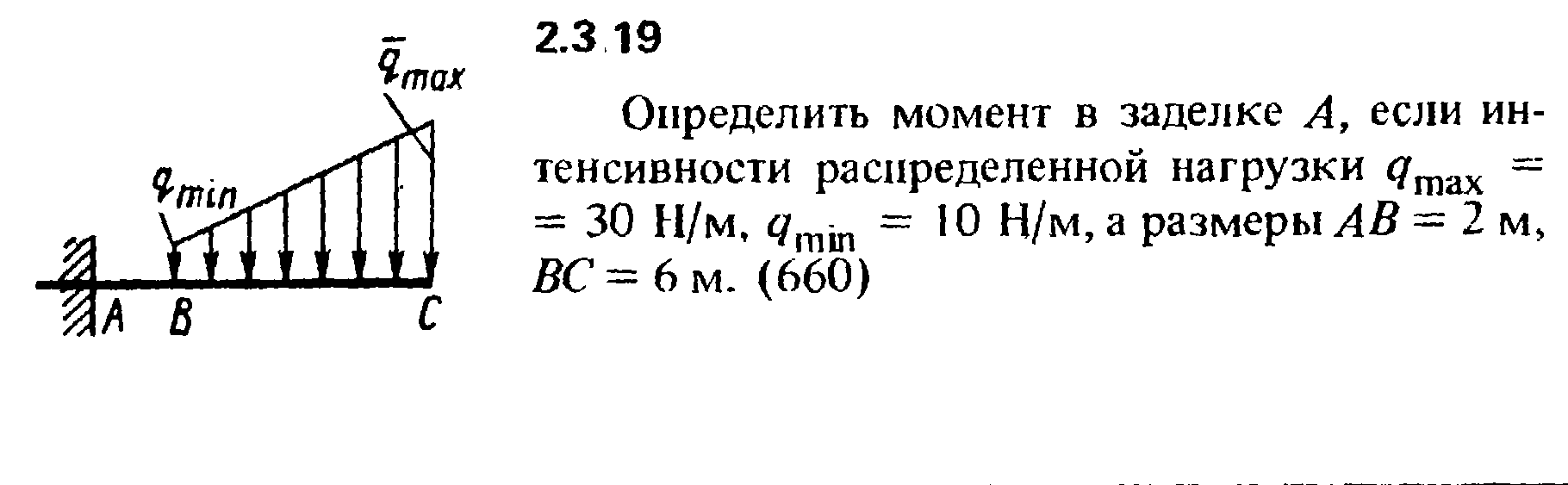 Определить момент в заделке А, если интенсивности распределенной нагрузки qmax = 30 Н/м, qmin = 10 Н/м, а размеры AВ = 2 м, ВС = 6 м.