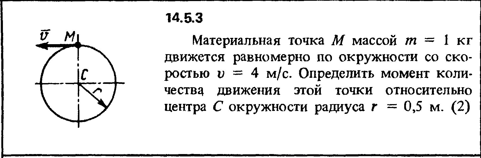 14.5.3. Материальная точка М массой m = 1 кг движется равномерно по окружности со скоростью v = 4 м/с. Определить момент количества движения этой точки относительно центра С окружности радиуса r = 0,5 м.