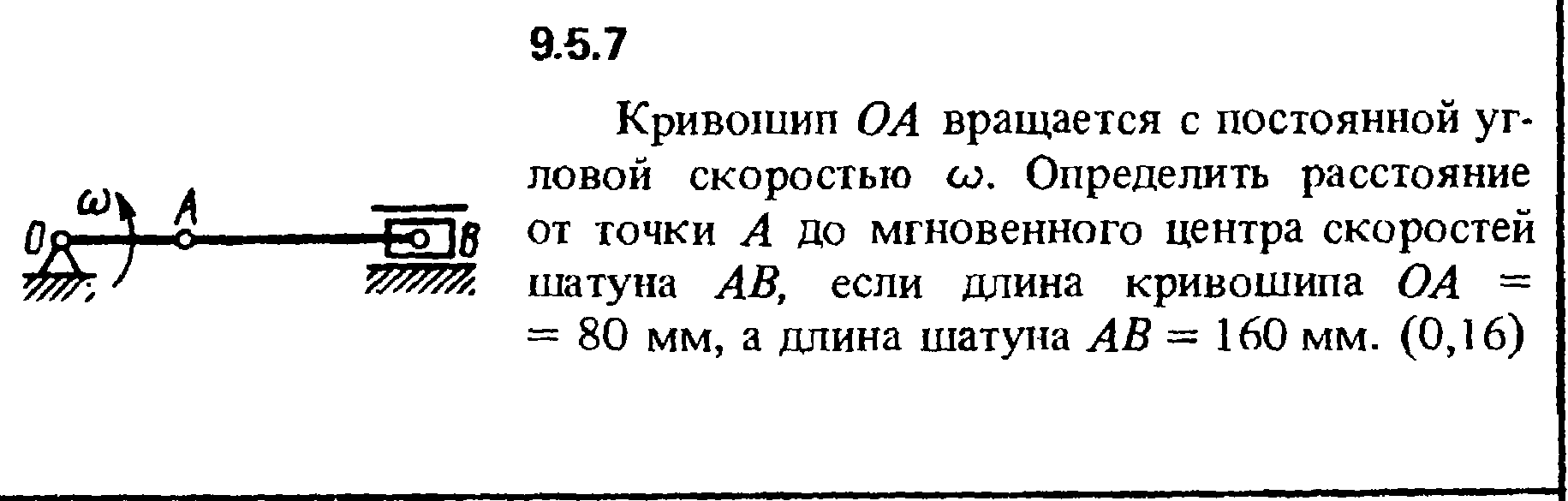 Кривошип ОА вращается с постоянной угловой скоростью ω. Определить расстояние от точки А до мгновенного центра скоростей шатуна АВ, если длина кривошипа ОА = 80 мм, а длина шатуна АВ = 160 мм.