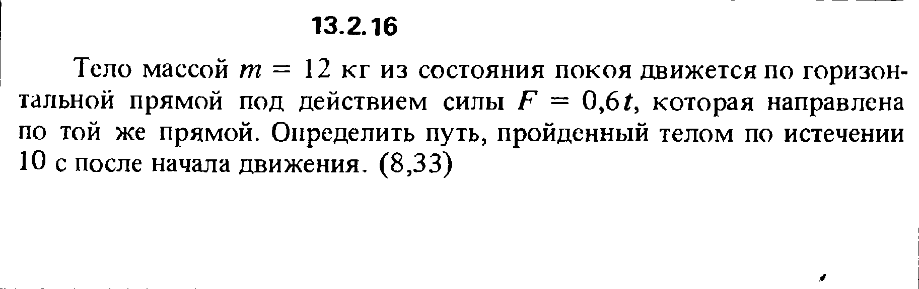 Тело массой m = 12 кг из состояния покоя движется по горизонтальной прямой под действием силы F = 0,6t, которая направлена по той же прямой. Определить путь, пройденный телом по истечении 10 с после начала движения.