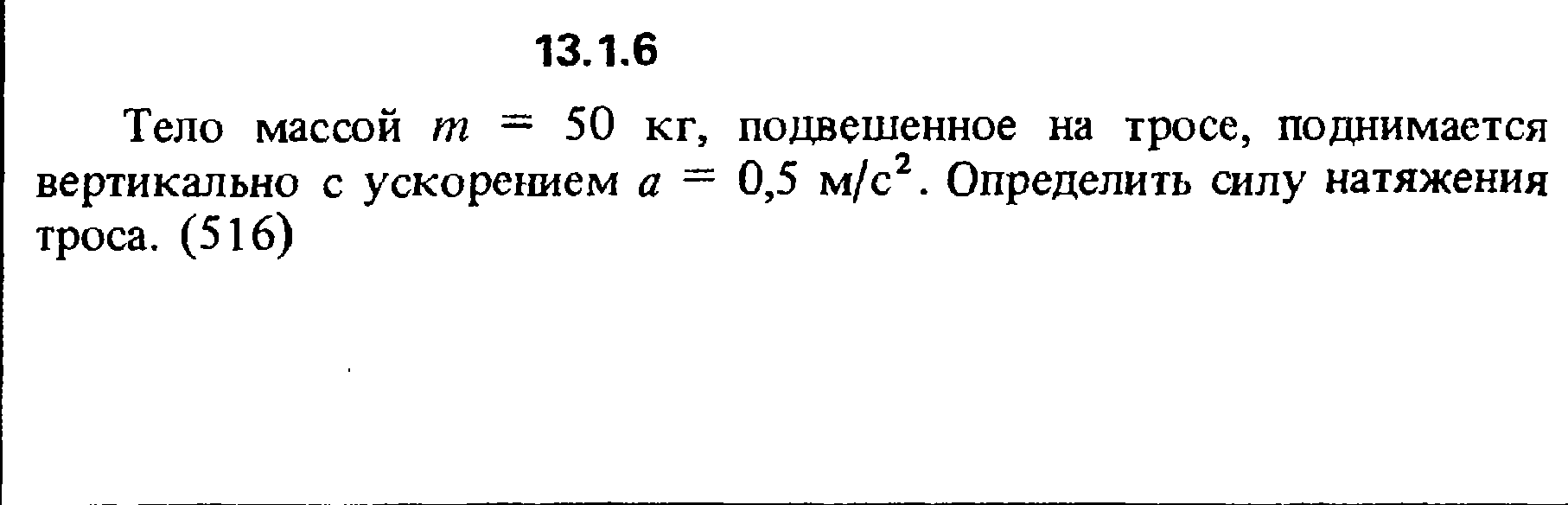 Тело массой m = 50 кг, подвешенное на тросе, поднимается вертикально с ускорением а = 0,5 м/с2. Определить силу натяжения троса.
