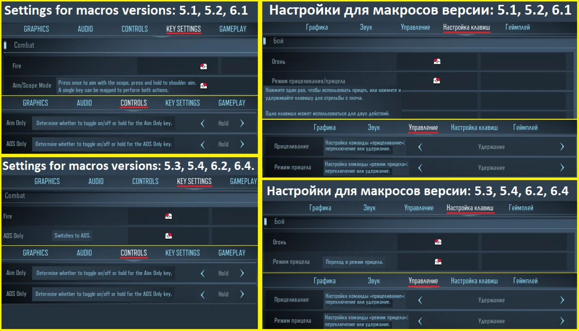 Внимание!!! Есть вероятность, что по техническим причинам ("Input Lag" - влияющий на работу макросов), или при модифицировании оружия, если прицел во время стрельбы тянет вниз, то уменьшаете значения в настройках чувствительности мыши в игре, если вверх, то увеличиваете. Также необходимо, чтобы у вас был фиксированный FPS. Если FPS будет падать, то начнется уменьшаться скорострельность и прицел потянет вниз, если фпс будет увеличиваться, то также будет увеличиваться скорострельность и прицел будет тянуть вверх.