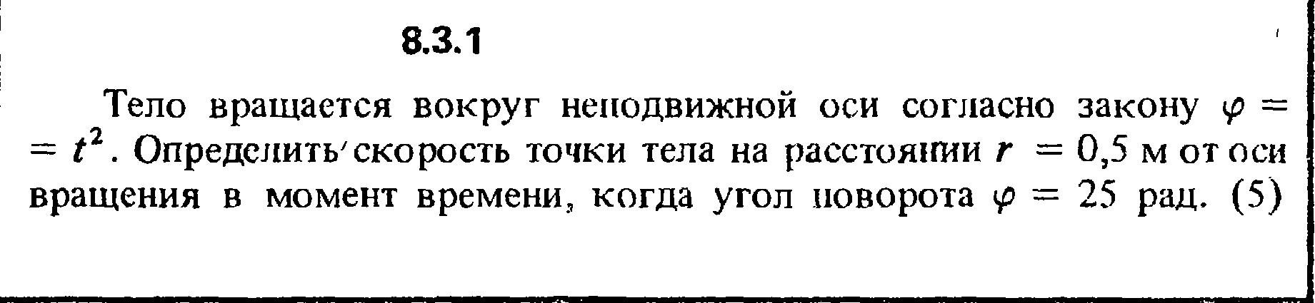 Тело вращается вокруг неподвижной оси согласно закону φ = t2. Определить скорость точки тела на расстоянии r = 0,5 м от оси вращения в момент времени, когда угол поворота φ = 25 рад.