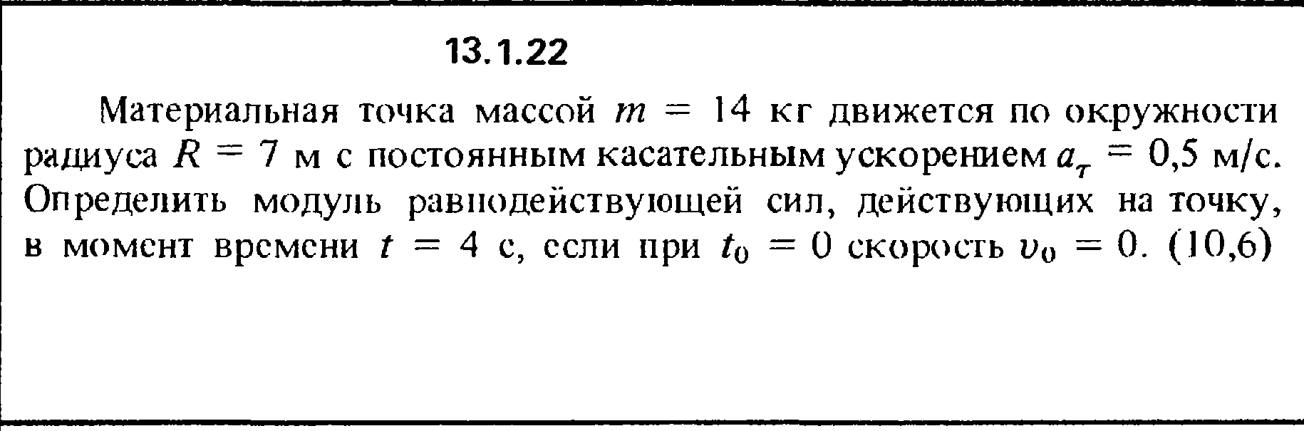 Материальная точка массой m = 14 кг движется по окружности радиуса R = 7 м с постоянным касательным ускорением аτ = 0,5 м/с. Определить модуль равнодействующей сил, действующих на точку, в момент времени t = 4 с, если при t0 = 0, скорость v0 = 0.