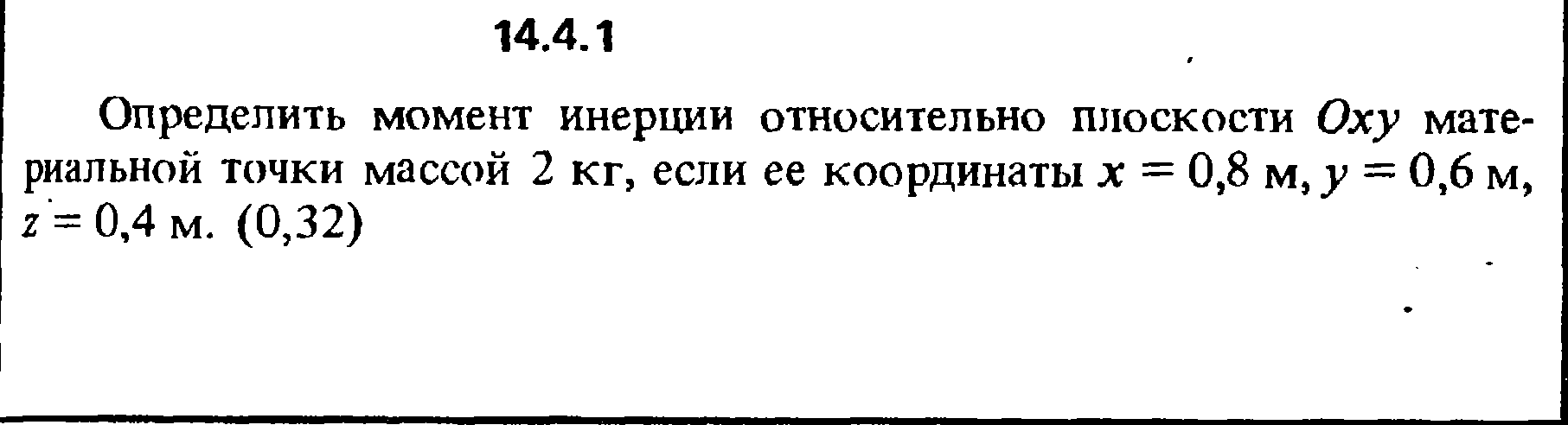 14.4.1. Определить момент инерции относительно плоскости Оху материальной точки массой 2 кг, если ее координаты х = 0,8 м, у = 0,6 м, z = 0,4 м.