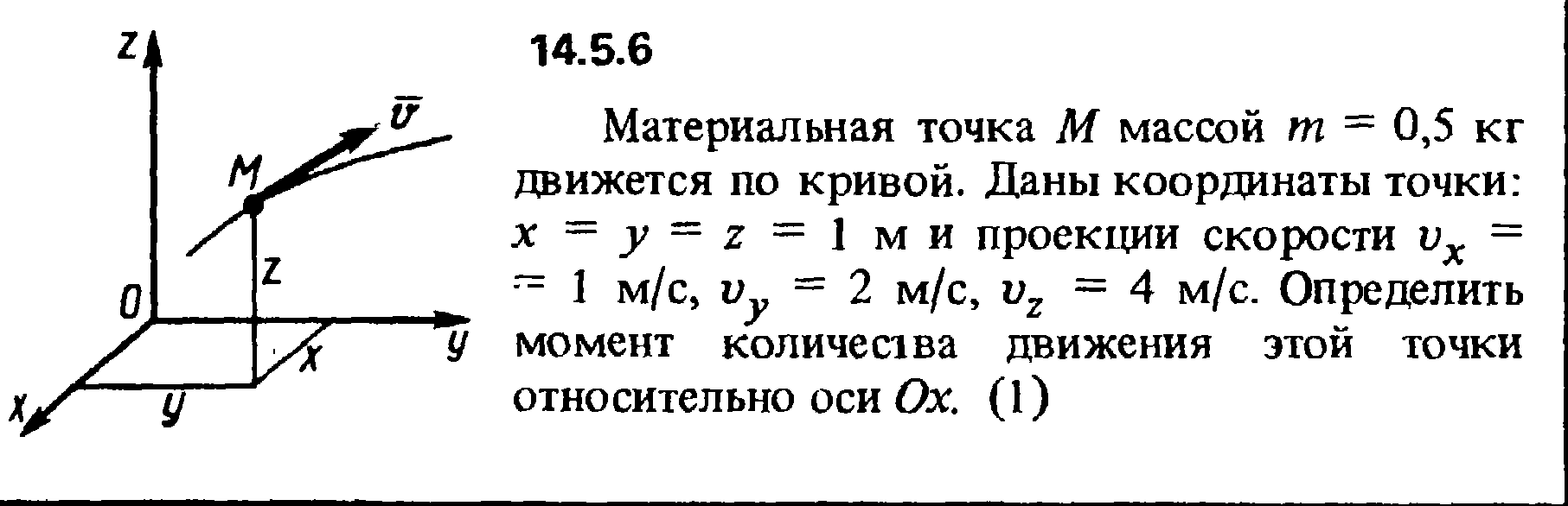 14.5.6. Материальная точка М массой m = 0,5 кг движется по кривой. Даны координаты точки: х = у = z = 1 м и проекции скорости vx = 1 м/с, vу = 2 м/с, vz = 4 м/с. Определить момент количества движения этой точки относительно оси Ox.