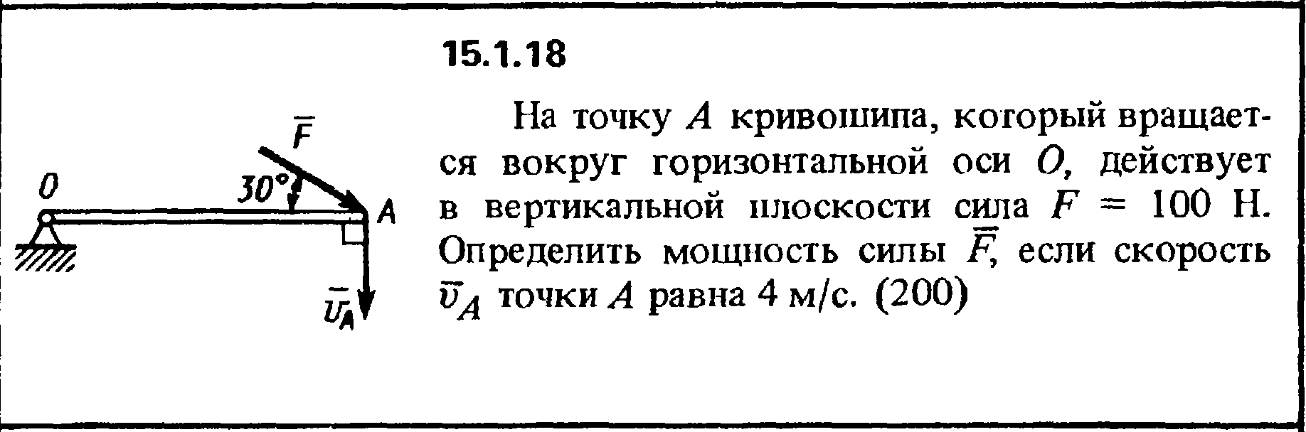 15.1.18 На точку А кривошипа, который вращается вокруг горизонтальной оси О, действует в вертикальной плоскости сила F = 100 Н. Определить мощность силы F, если скорость vA точки А равна 4 м/с.