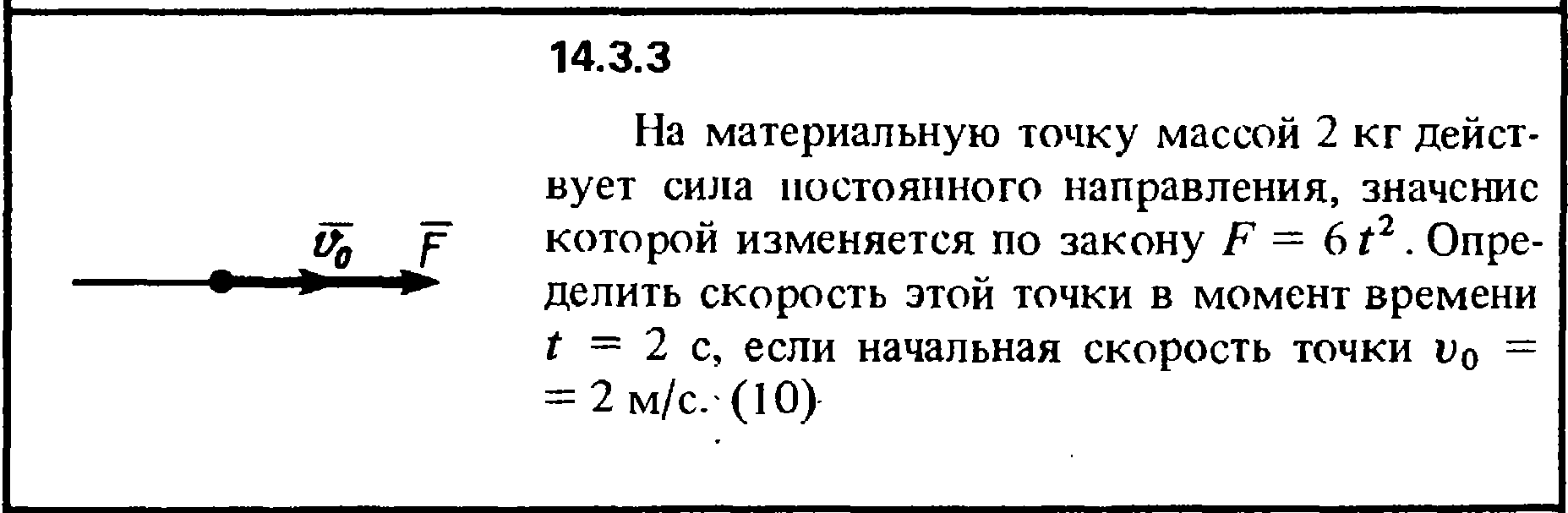 14.3.3. На материальную точку массой 2 кг действует сила постоянного направления, значение которой изменяется но закону F = 6t2. Определить скорость этой точки в момент времени t = 2 с, если начальная скорость точки v0 = 2 м/с.