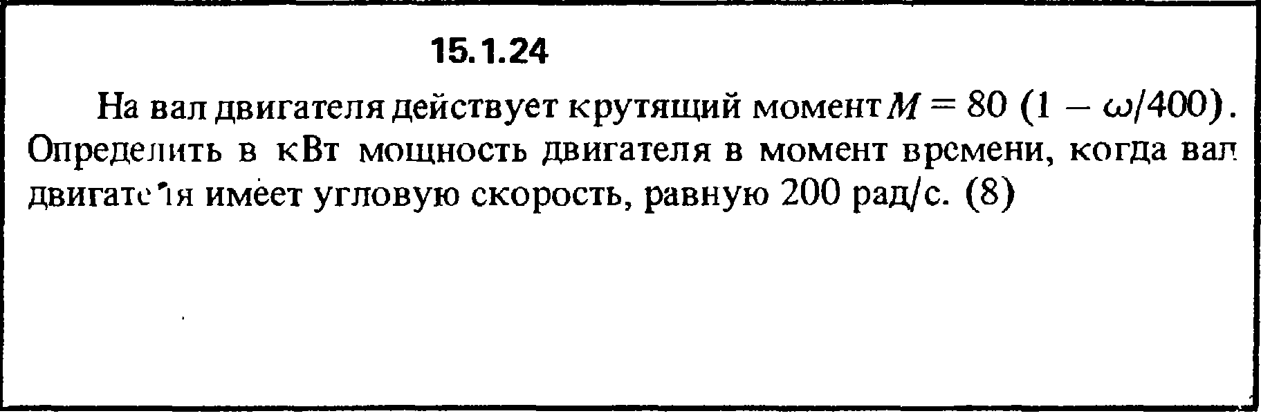 15.1.24 На вал двигателя действует крутящий момент М = 80 (1 - ω/400). Определить в кВт мощность двигателя в момент времени, когда вал двигателя имеет угловую скорость, равную 200 рад/с.