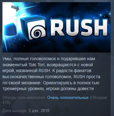 К радости фанатов высококачественных головоломок, RUSH проста по своей механике. Ориентируясь в полностью трехмерных уровнях, игроки должны довести цветные кубы к выходу того же цвета, используя конвейерные ленты, телепорты, знаки остановок, повороты и множества прочих возможностей! Игра легко управляется мышью, позволяя мозгу сфокусироваться только на поиске решения!