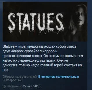 Statues – игра, представляющая собой смесь двух жанров: сурвайвал-хоррор и приключенческий экшен. Основным ее элементом являются леденящие душу враги. Они не движутся и не представляют опасности, только когда главный герой, не моргая, смотрит на них. Эти враждебные существа лишат Вас чувства безопасности на протяжении всей игры.