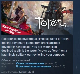 Experience the mysterious, timeless world of Toren, the first adventure game from Brazilian indie developer Swordtales. You are Moonchild, destined to climb the tower (known as Toren) on a hauntingly solitary journey to find your purpose. You must solve puzzles and face monsters as you struggle to climb to the top of this beautiful, yet treacherous environment, driven by the will to find your freedom.