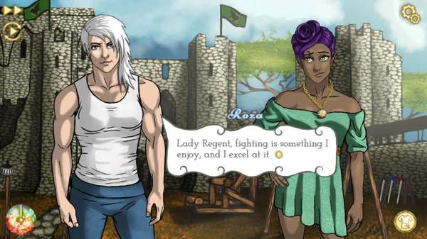 Serafina's Crown is a fantastical, dramatic visual novel with branching storylines, a stat-based strategy game, and dating-sim elements. In the game -- which takes place in the same world as Woodsy Studio's first release, Serafina's Saga -- you play as Odell Perin, an inexperienced young woman who must navigate political intrigue, romantic confusion, and an ongoing murder mystery while serving as Regent of Darzia. The branching storylines depend on your decisions: forming romantic relationships with other characters, finding Queen Belatrix's killer, and determining the next monarch. The game also features a dynamic debate system that allows Odell to argue certain points in court based on her accumulated stats.