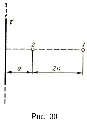 349. Электрическое поле создано бесконечной заряженной прямой линией с равномерно распределенным зарядом (τ = 10 нКл/м). Определить кинетическую энергию T2 электрона в точке 2, если в точке 1 его кинетическая энергия T1 = 200 эВ (рис. 30).