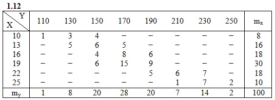 Дана таблица распределения 100 заводов по производственным средствам X(тыс. ден. ед.) и по суточной выработке Y(т). Известно, что между X и Y существует линейная корреляционная зависимость. Требуется: