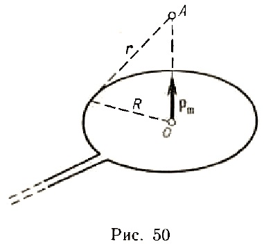 402. Магнитный момент pm тонкого проводящего кольца pm = 5 А.м2. Определить магнитную индукцию B в точке A, находящейся на оси кольца и удаленной от точек кольца на расстояние r = 20 см (рис. 50).