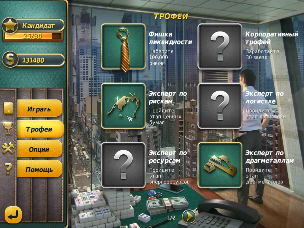Стань акулой бизнеса — сыграй в маджонг на бирже!Пройди более 100 уровней игры, зарабатывая очки и многочисленные трофеи. Иди вверх по лестнице успеха и Уолл-стрит покорится тебе!Каждый пак олицетворяет собой отдельный рынок — от фондового до рынка высоких технологий. Расклад каждого уровня содержит определенное количество золотых костяшек, которые приносят игроку гораздо больше очков, чем обычные. Это делает оформление уровней и игровой процесс более разнообразным. Уровни сбалансированы по сложности: есть классические уровни и расклады с блуждающими костяшками, в которых расположение фишек меняется с каждой новой попыткой.