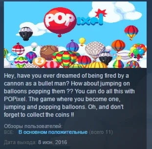POPixel is a game made with pixelart. It's the perfect mix between casual and adventure styles. You control an acrobat bullet-man that blows up balloons jumping on them, but it's not that simple: each balloon has an unique behavior.