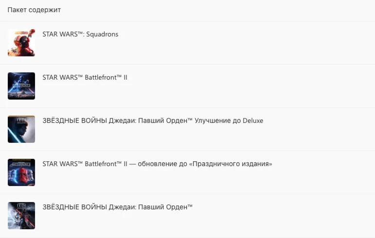 ????Участвуйте в стратегических многопользовательских боях вместе со своей эскадрильей и узнайте, каково быть пилотом, в захватывающей одиночной истории во вселенной ЗВЁЗДНЫХ ВОЙН™ в STAR WARS™: Squadrons. Станьте джедаем-падаваном в одиночном сюжетном экшн-приключении «ЗВЁЗДНЫЕ ВОЙНЫ Джедаи: Павший Орден™ — издание Deluxe», действие которого разворачивается после Истребления, санкционированного Приказом 66. Пустите в ход бластер, световой меч и Силу в масштабных многопользовательских сражениях в «STAR WARS™ Battlefront™ II: Праздничное издание».????