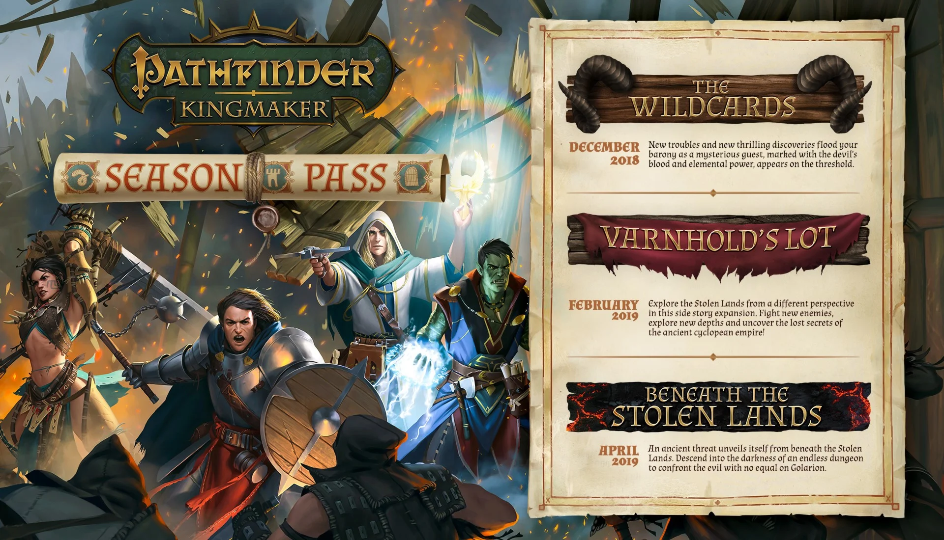 Новая бонусная кампания. Празднуя свою победу в особняке Джаманди Алдори, вы встретили еще одного героя Украденных земель: капитана наемников Мейгара Варна. Пока вы строите свое баронство в Шрайк-Хиллз и Нарлтопах, Варн и его люди основывают свое собственное государство Варнхолд в скалистых предгорьях Дансварда. Против чего они должны были идти? Сыграйте в эту новую историю и экспортируйте последствия решений, которые вы сделали в основной кампании!