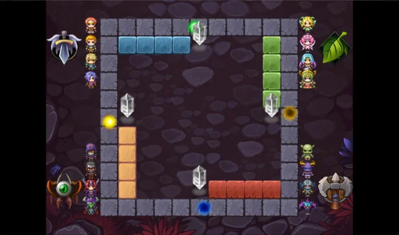 4 игрока. Если на кубике выпадает 6, то можно вывести персонажа из "дома".Нужно довести всех своих героев по кругу до кристалла. После нажатия на «фишку» героя выбирается количество «клеток» для хода.