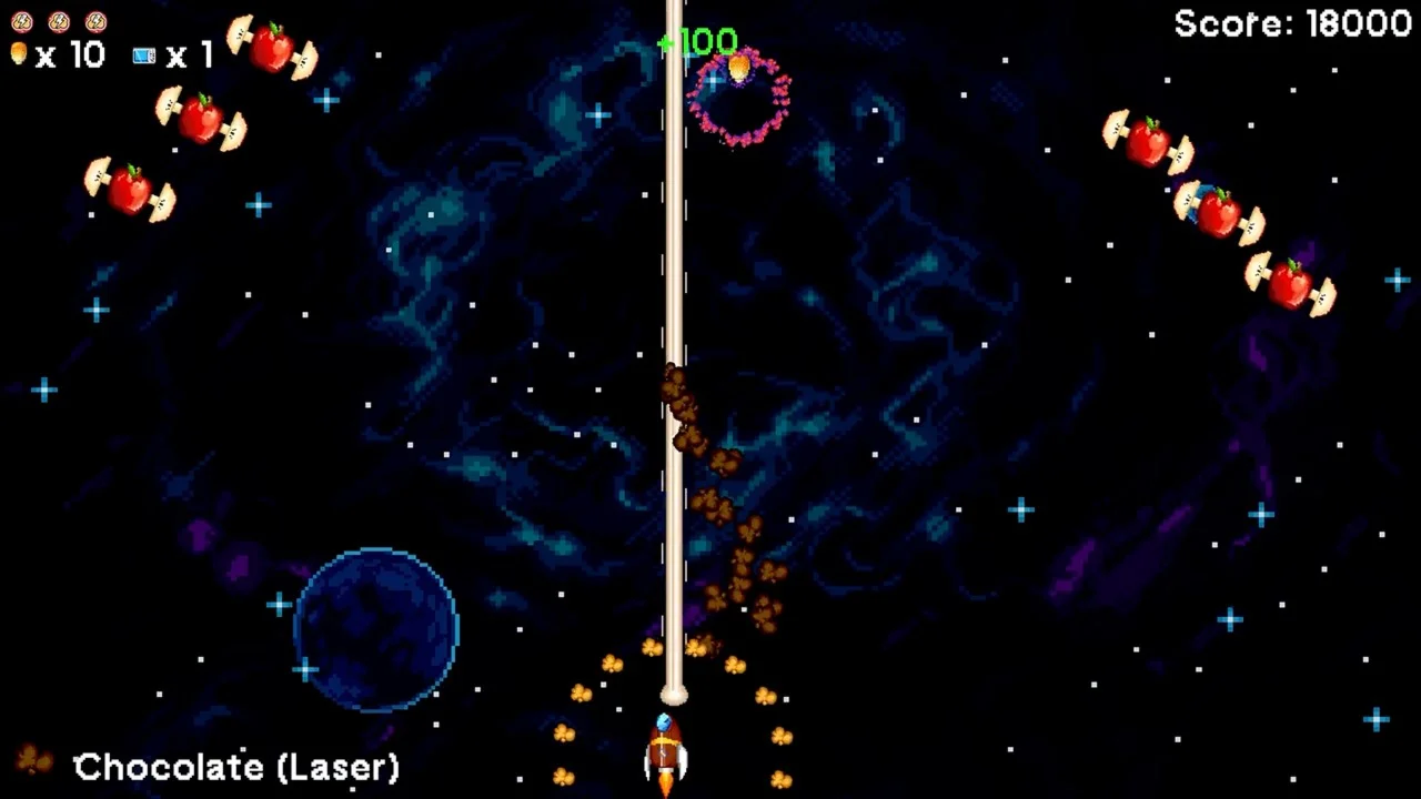 Popcorn Rocket is no simple bag of microwave popcorn as it's a shoot-em-up with a capital "S". Your spaceship piloting skills must be at their best to avoid the multitude of calories the Nebula Empire throws at you! Battle challenging food based enemies and bosses which will test your mettle and if you're not careful, the Nebula Empire will clog your arteries! This isn't a place for simple microwave popcorn, you gotta bring your full buttery movie popcorn to this show in order to survive!