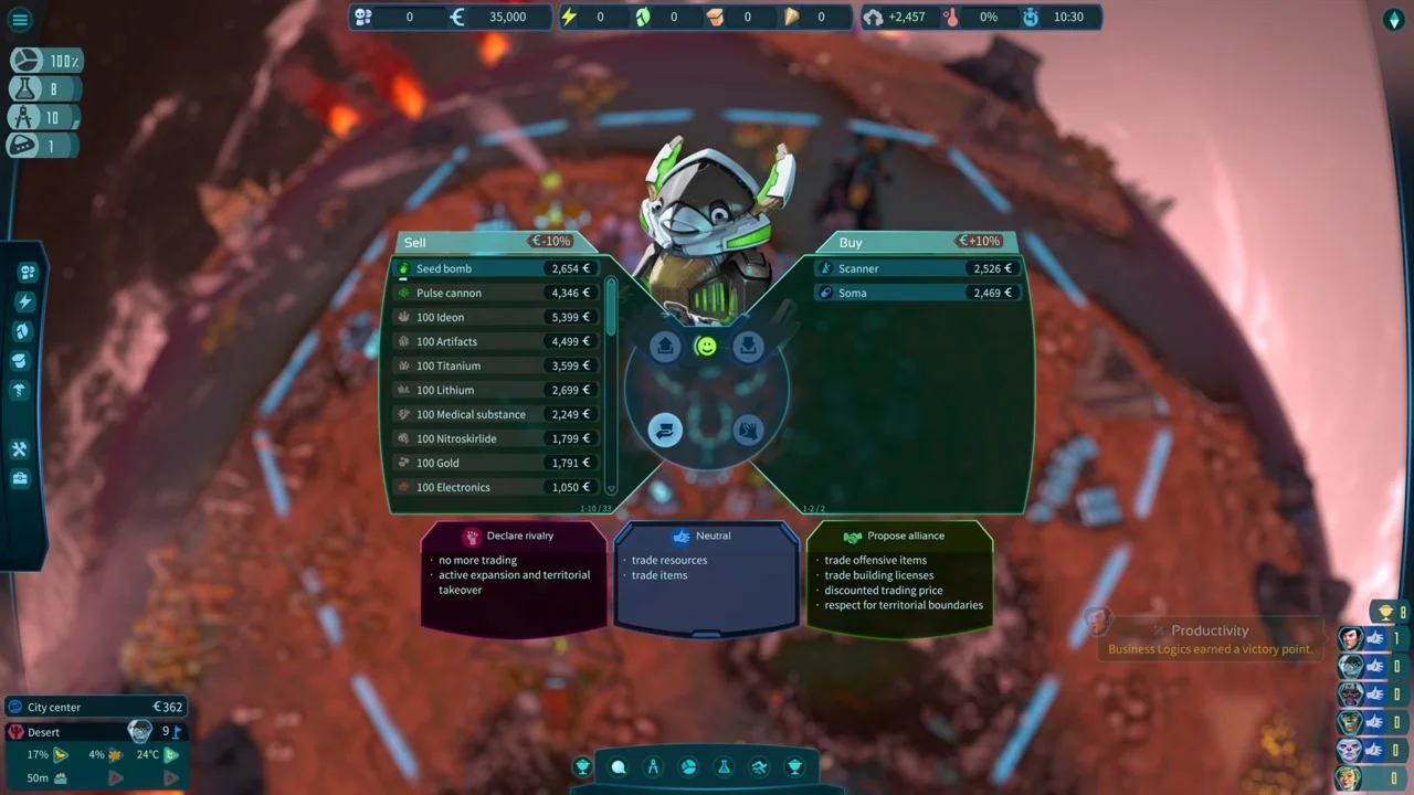 Местные и залетные торговцы, наряду с союзными колониями и племенами, готовы скупать добываемые ресурсы, предлагая на продажу дорогие технологии и оборудование.