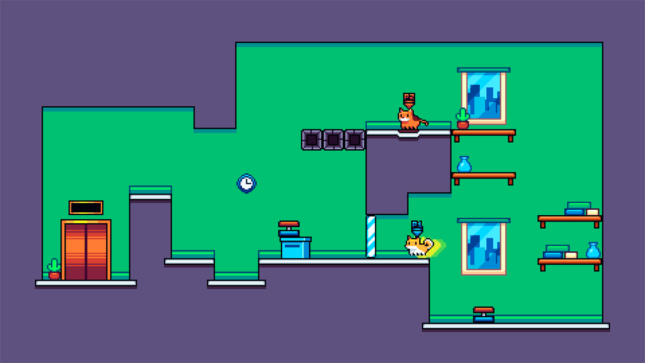 Кое-какие питомцы заблудились в офисе, и теперь этим собачкам и кошечкам нужно действовать вместе, используя коробки, коврики и кнопки, чтобы добраться до выхода.